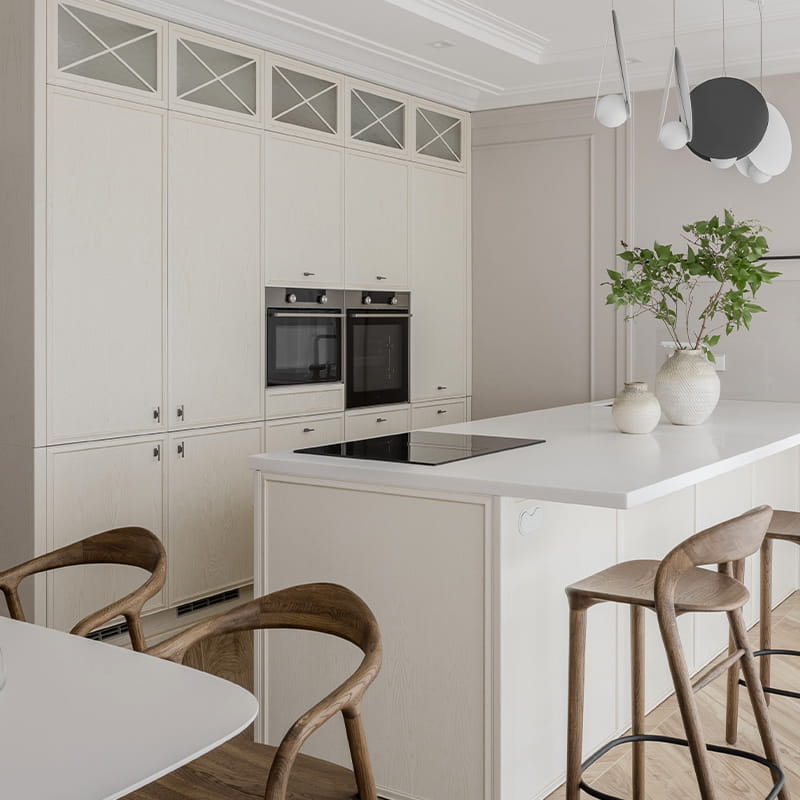 - массив. Натуральное дерево эффектно смотрится на классической кухне, активно применяется и в современных интерьерах. Такие фасады отличаются высоким качеством и долговечностью при соответствующем уходе, главным условием которого является поддержание подходящего микроклимата (влажность на уровне 40–60 %);